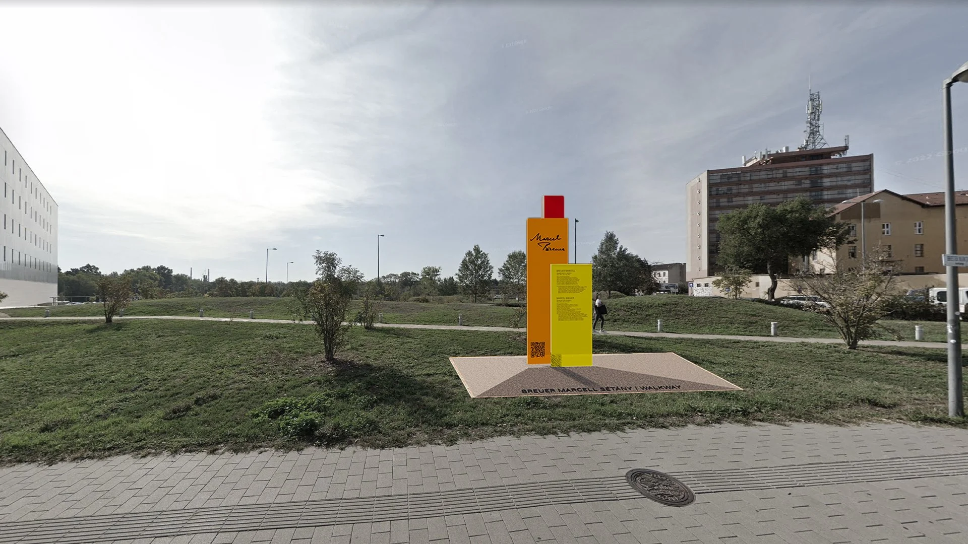 Az emlékmű-kompozíció alapja a Breuer híres Whitneymúzeumának jellegzetes monitorablakának fektetett átirata. Ez a megidézett kontúr adja a lágy rézsűből való kimetszést is egyben. Anyaga előregyártott világosszürke járható és csúszásmentes designbeton, mely feszes vetítővászonként fogadja majd az üvegtestek színes árnyékait. Középen áll a pályázatban kiírt oszlopszerű emlékmű, melynek anyaga teljes egészében üveg. Maga Breuer is szerette e két anyag nyers kapcsolatában rejlő művészi expresszivitást érvényre juttatni.