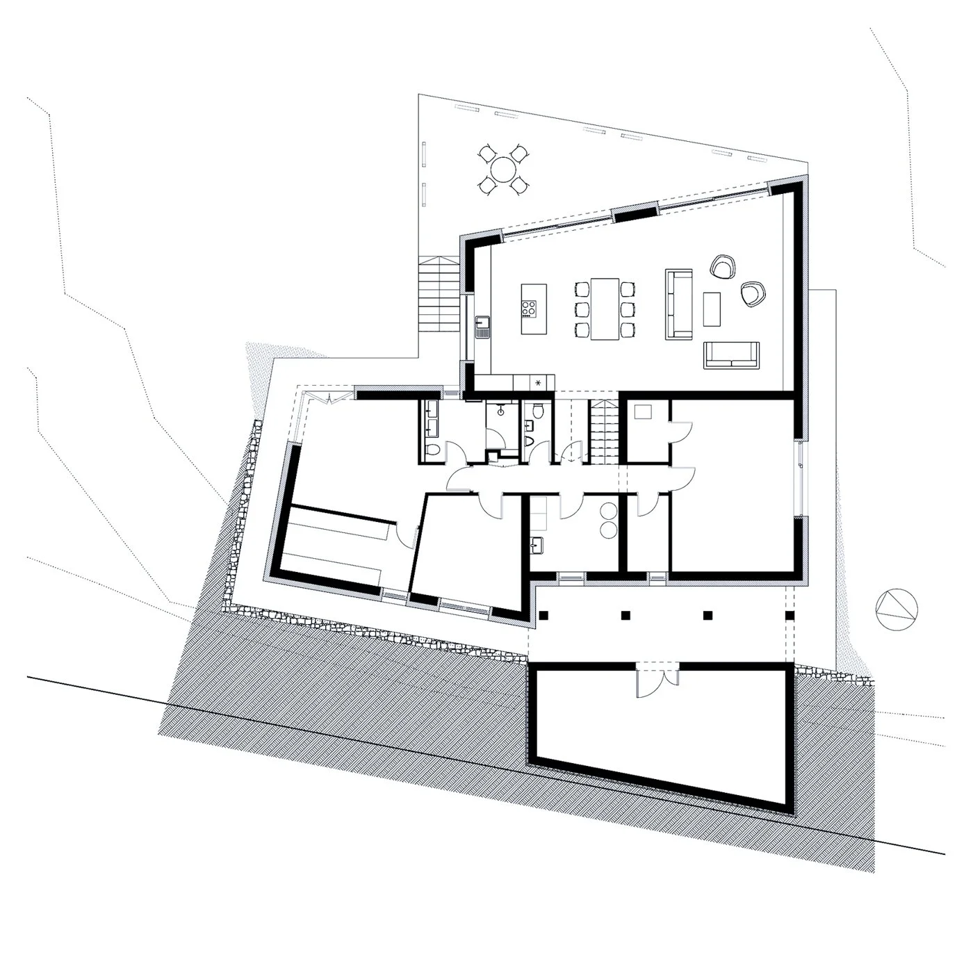 Jahoda Róbert új lakóháza kertvárosias területen épült, ahol az utcakép igen heterogén, az építészeti kontextust pedig a néhány évtizede épült családi házak jelentik. Az utca felé egyszerű kubussal fordul, nem hivalkodik, a gazdag formai koncepció az épületet körbejárva és a kert felől bontakozik ki. A tető a bejárattól indulva lejtősen fedi át a különböző szinteket, majd a kerthez érve hirtelen emelkedve rajzol V alakot. A terasz felett így a szokásostól eltérően nem csökken, hanem megnő a magasság, kinyílva a kert és a kilátás irányába. Erőteljes formájával egyedi karaktert ad a háznak, de nem válik öncélúvá, funkcionálisan is érthető.